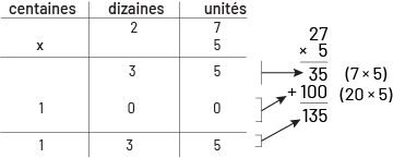 image Tableau de valeur de position, centaines, dizaines, unités, où sont placés les nombres suivants : 27 multiplié par 5. 7 multiplié par 5 est égal 35.20 multiplié par 5 est égal à 100.100 plus 35 est égal à 135.La multiplication 27 fois 5 est ensuite écrite verticalement.