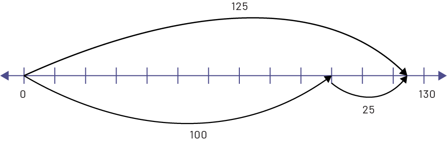 Droite numérique de zéro à 130 par intervalles de dix.Une flèche part de zéro et pointe 100, montrant un bond de plus