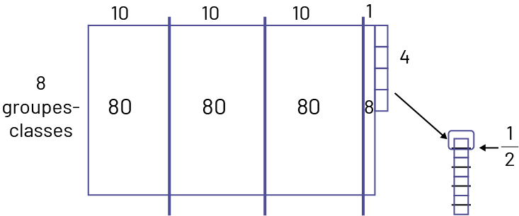Elle distribue \(\ 31\frac{1}{2}\) paquets à chaque groupe-classe.