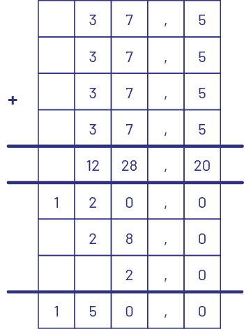 \(\begin{align}\;12,5\; + \;12,5\; + \;12,5 &= 25\; + \;12,5 \\ &= \;37,5 \end{align}\)