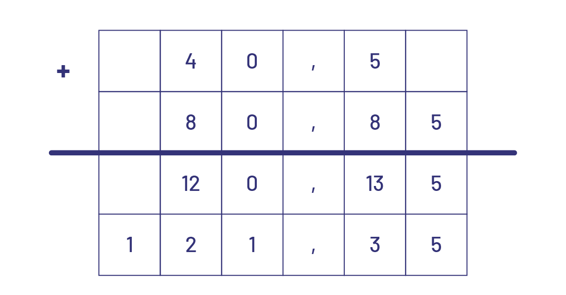 Une addition verticale est placée dans un tableau en respectant une valeur de position par case, plus une case pour la