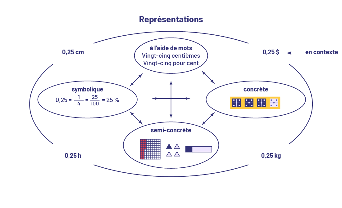 image Représentations.Une ellipse ayant dans son pourtour les 4 expressions suivantes disposées:- Zéro virgule 25 centimètres- Zéro virgule 25 dollars- Zéro virgule 25 kilogrammes- Zéro virgule 25 heureÀ l’intérieur de l’ellipse on retrouve 4 autres ellipses décrivant chacune une façon de représenter un nombre:Première ellipse:À l’aide de motsVingt-cinq centièmes écrits en motsVingt pour cent écrits en motsDeuxième ellipse:ConcrèteEnsemble de 4 carrés ayant 4 unités chacun et dont l’un des carrés est d’une couleur différente.Troisième ellipse:Semi-concrèteUne planchette de 100 unités ayant 25 unités de couleur rougeUn ensemble de 4 triangles dont l’un des 4 est de couleur différenteUn bâtonnet dont une partie est de couleur différente.Dernière ellipse:SymboliqueZéro virgule 25 égal un sur 4 égal 25 sur 100 égal 25 pour 100.Il y a, des doubles flèches montrant que chacune des 4 ellipses sont équivalentes.