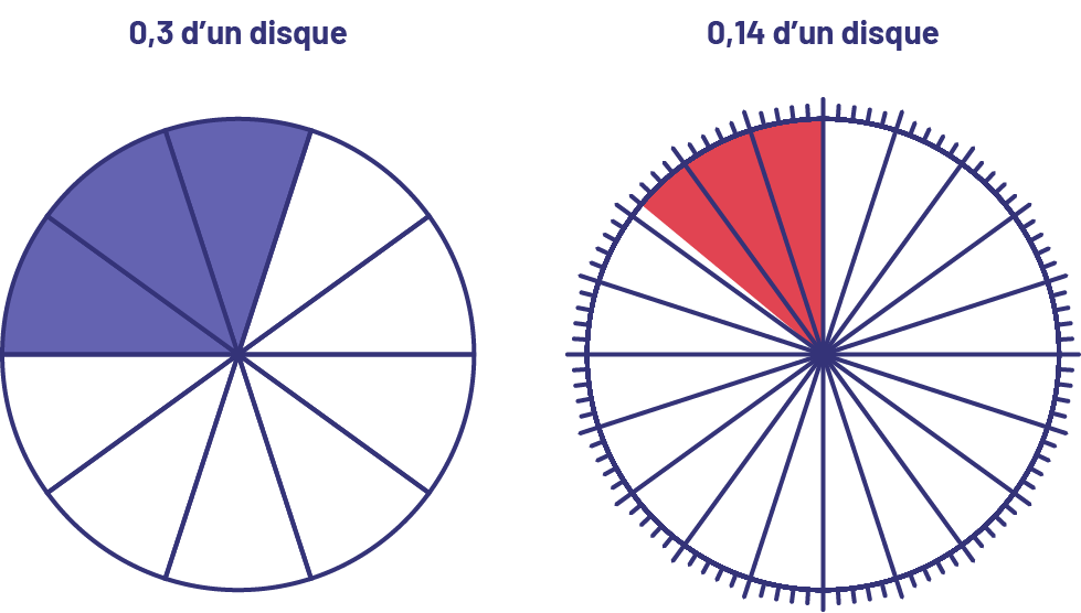image Image un: Zéro virgule 3 d’un disque.Un disque divisé en dix parties égales dont 3 dont mauve.Image 2: Zéro virgule 14 d’un disqueUn disque divisé en 25 parties égales chacune ayant des tirets la séparant en 5 petites parties égales.2 grosses parties et 4 petits tirets du disque sont rouge.