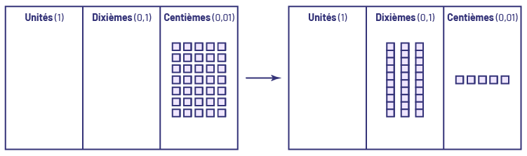 image Un tableau de position des unités « un », des dixièmes « zéro virgule un » et des centièmes « zéro virgule zéro un ». Il y a 35 cubes dans les centièmes. Dans un autre tableau des positions, les centièmes ont été redistribués. 30 cubes sont maintenant dans la colonne des dixièmes, et 5 cubes sont dans la colonne des centièmes.
