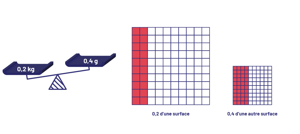 Dans ces exemples, même si le nombre 0,2 est inférieur au nombre 0,4 (0,2 < 0,4), 0,2 kg est une masse plus grande que 0,4 g, tout comme 0,2 du gros carré est une surface plus grande que 0,4 du petit carré.