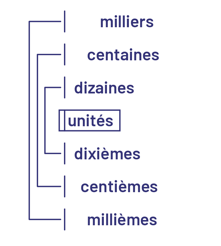 image De gauche à droite: milliers, centaines, dizaines, unité, la virgule, les dixièmes, les centièmes et les millièmes. Le mot unité est encadré. Les dizaines et les dixièmes sont reliés.Les centaines et les centièmes sont reliés.Les milliers et les millièmes sont reliés.