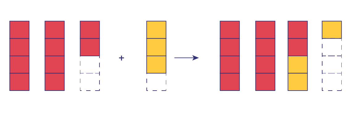 image 2 rectangles composés de 4 espaces remplis en rouge et un troisième rectangle dont 2 espaces sont en rouge. Les deux autres espaces de ce rectangle sont vides. On additionne un rectangle identique, 3 de ces espaces sont remplis en jaune, le quatrième est vide. Une flèche nous pointe vers une modification. Il y a toujours 4 rectangles, 2 sont complètement rouges, le troisième a 2 parties en rouge et 2 parties en jaune. Le quatrième a une partie jaune.