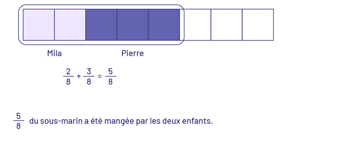 Mila a mangé \(\frac{2}{8}\) d’un sous-marin, alors que Pierre en a mangé \(\frac{3}{8}\). Quelle fraction du sous-marin a été mangée par les 2 enfants?