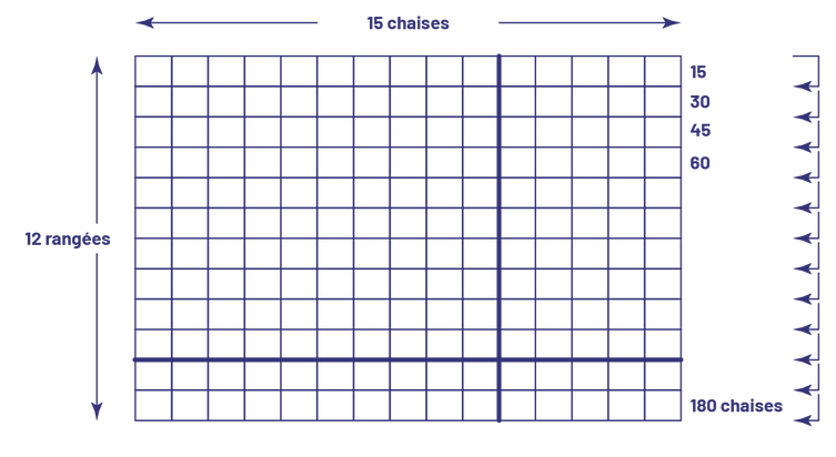 image Une disposition rectangulaire de 12 rangées de 15 chaises. Au bout des 4 premières rangées, le total des chaises est inscrit, soit, 15, 30, 45, 80.Le total des chaises à la dernière rangée est de 180.Des flèches passent d’une rangée à une autre, du haut vers le bas pour indiquer que le décompte des chaises est une addition de plus 15.