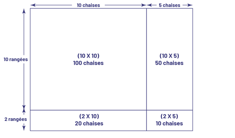 image Une disposition rectangulaire. Le rectangle a dix chaises plus 5 chaises de longueur. Le rectangle a dix rangées plus 2 rangées.Le rectangle est donc divisé en 4 parties. La première a 100 chaises (parenthèse ouvrante) dix fois dix (parenthèse fermante).La deuxième, 50 chaises (parenthèse ouvrante) dix fois 5 (parenthèse fermante).Le troisième, 20 chaises (parenthèse ouvrante) 2 fois dix (parenthèse fermante). Le quatrième, dix chaises (parenthèse ouvrante) 2 fois 5 (parenthèse fermante).