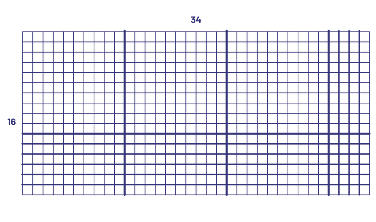 image Une disposition rectangulaire, tracée sur du papier quadrillé, de, 34 carreaux par 16 carreaux.Des traits en caractère gras ont délimité des carrés de dix carreaux par dix carreaux.On obtient 3 carrés de dix par dix, 3 rectangles de 6 par dix, un rectangle de dix par 4 et un rectangle de 6 par 4.