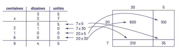 Lorsque le nombre 35 est décomposé en 30 et 5, et que le nombre 27 est décomposé en 20 et 7, on se trouve à réduire le produit \(35\; \times \;27\) à la somme de 4 produits partiels faciles à calculer, soit \(\left( {20\; \times \;30} \right)\; + \;\left( {20\; \times \;5} \right)\; + \;\left( {7\; \times \;30} \right)\; + \;\left( {7\; \times \;5} \right)\), pour un total de 945 personnes.