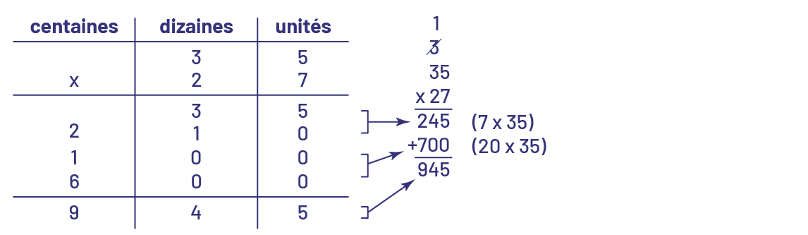 image Tableau de valeur de position.3 dizaines et 5 unités multiplié par 2 dizaines et 7 unités.& fois 5, égal 3 dizaines et 5 unités.7 fois 30 égal 2 centaines, une dizaine et zéro unité.20 fois 5, une centaines zéro dizaine et zéro unité.20 fois 30, 6 centaines, zéro dizaine, zéro unité.Le total est 9 centaines, 4 dizaines, 5 unités.La multiplication est posée verticalement :35 fois 27 égal 245 plus 700 égal 945.Il y a 3 et un en retenue au-dessus de l’unité.245 est obtenue avec la multiplication 7 fois 35.700 est obtenue avec la multiplication 20 fois 35.