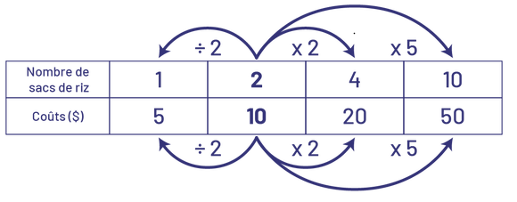 Pour 10 sacs de riz, le coût sera 50 $. 10 sacs c’est 5 fois plus que 2, donc le prix est 5 fois plus que 10 $.