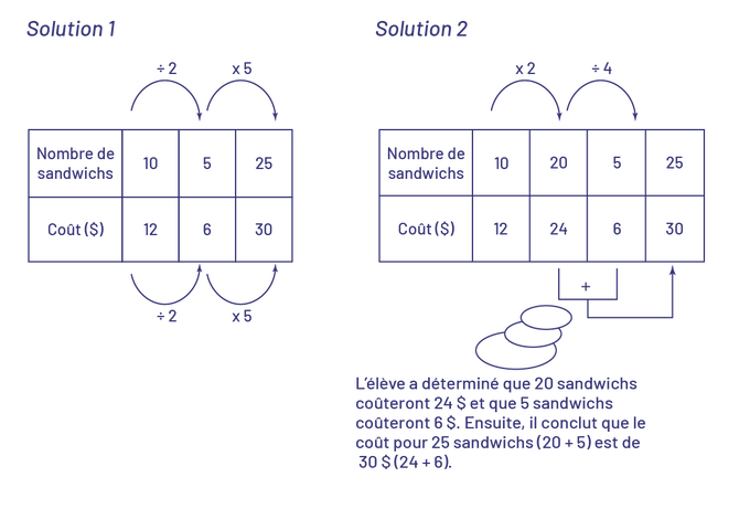 sandwichs à 6 dollars, puis détermine que 25 sandwichs (parenthèse ouvrante) 5 fois 5 sandwichs (parenthèse fermante)