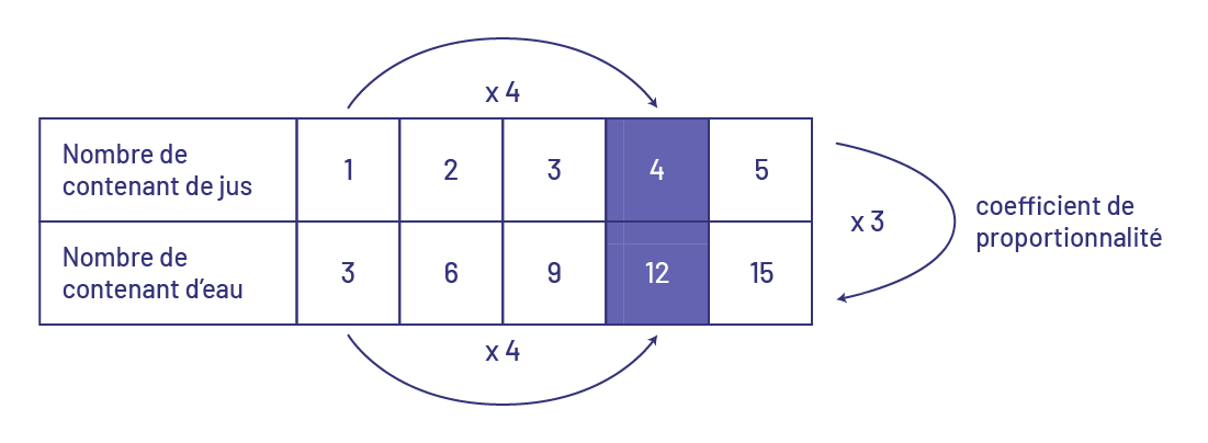 pour 12 contenants d’eau. 5 contenants de jus pour 15 contenants d’eau. Le coefficient de proportionnalité est de «