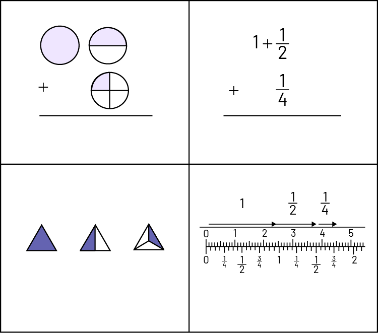 à un cercle dont un quart est violet. Dans le deuxième rectangle, il est écrit : un plus un demi plus un quart. Dans