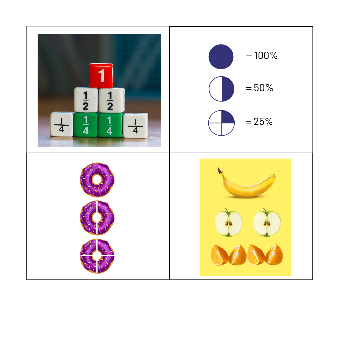 deuxième est coupé en deux et le troisième est coupé en quatre. Dans le troisième rectangle, il y a une banane