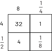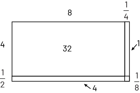 QUESTIONNEMENT Comment la disposition rectangulaire facilite-t-elle la multiplication de fractions? Comment as-tu déterminé où placer les nombres naturels (4, 8) et les fractions \(\frac{1}{2}\), \(\frac{1}{4}\)? Comment obtiens-tu les nombres dans les cases?