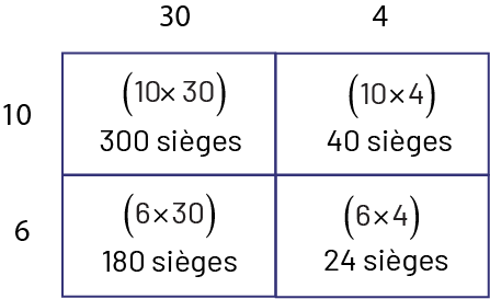 sièges. Deuxième rectangle : à l’intérieur, il est écrit : parenthèse ouvrante dix fois quatre parenthèse fermante.