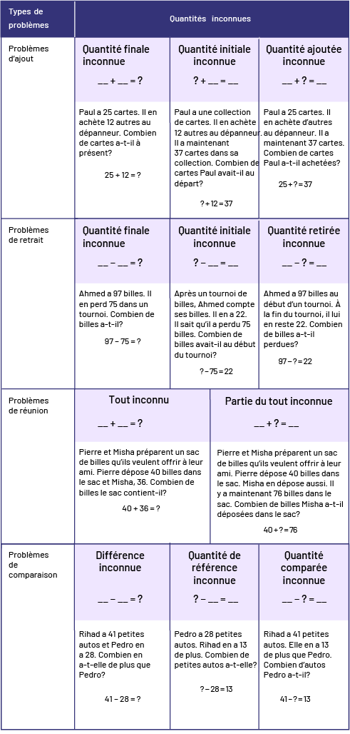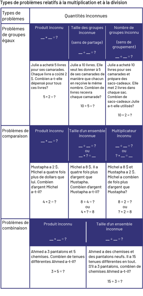 Il est essentiel de traiter des 2 types de problèmes, puisqu’ils sont la base de l’intégration d’autres concepts mathématiques. Il n’est pas nécessaire que les élèves sachent le nom des types de problèmes, mais il est essentiel qu’elles et ils aient l’occasion d’en résoudre de divers types, tout en employant une variété de stratégies.