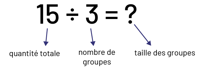 15 est la quantité totale, trois est la taille des groupes et point d’interrogation est le nombre de groupes.