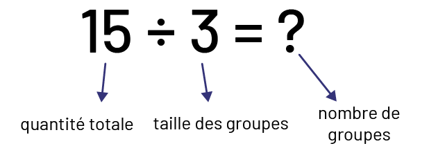 La division a un sens de groupement lorsque la quantité totale et le nombre d’éléments dans chaque groupe (taille des groupes) sont connus (par exemple, on a 15 pommes et on veut les placer dans des sacs, 3 pommes par sac; on cherche le nombre de sacs qu’il faut).