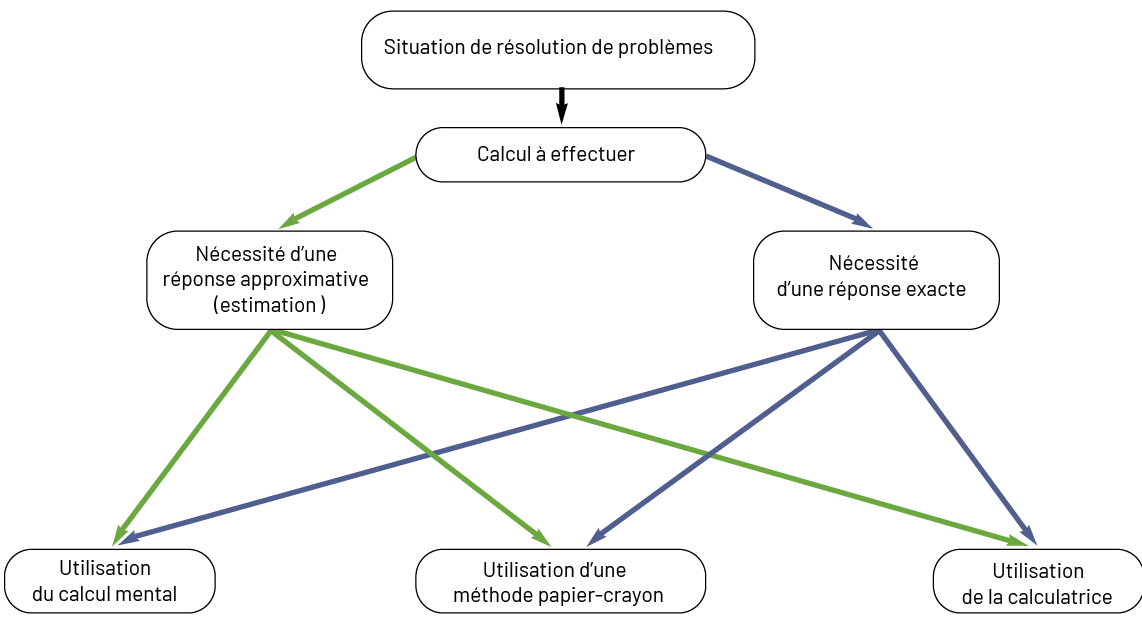 Que ce soit un problème comportant une opération ou plus d’une opération, les élèves doivent prendre des décisions et faire des choix en fonction du contexte. Une approche axée sur la résolution de problèmes les initiera à cette réflexion. Devant un problème, il faut d’abord l’analyser afin d’en déterminer les données et de comprendre qu’un calcul doit être effectué. Ensuite, il faut savoir si, selon le contexte, on cherche une réponse approximative ou une réponse exacte. Dans les 2 cas, selon le contexte et les nombres en cause, il faut ensuite déterminer si le calcul sera effectué mentalement, par écrit ou à l’aide d’une calculatrice. Enfin, le calcul désiré est effectué.