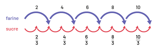 la farine vont comme suit : deux, quatre, six, huit, dix. Dix est encerclé, et une flèche relie deux à dix.Les