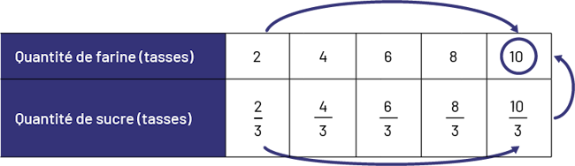 Ce type de représentation montre que la quantité d’ingrédients de la recette est quintuplée si \(3\frac{1}{3}\) tasses de sucre sont utilisées. Transposée dans un tableau, la représentation s’apparente à une représentation familière pour les élèves, soit la table de valeurs qui a l’avantage de les aider à vérifier la présence d’une relation multiplicative entre les quantités.