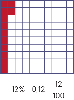 en blanc. Sous la grille il est écrit : douze pourcent égale zéro virgule douze égale douze sur cent.