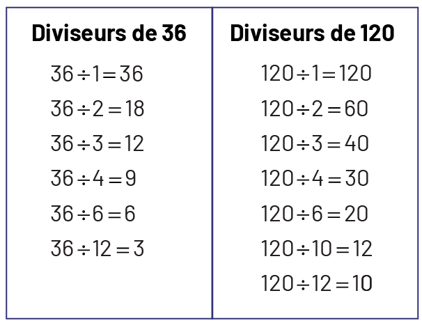 Pour résoudre ce problème, les élèves peuvent dresser la liste des diviseurs possibles de 36 et de 120.