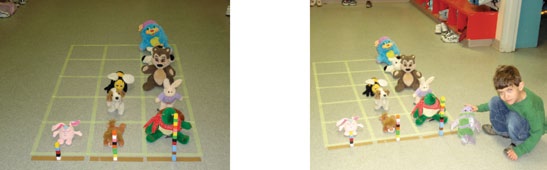 Avant l’activité, préparer un espace quadrillé sur le plancher pour créer un diagramme concret. Former trois tours de différentes hauteurs (courte, moyenne et longue) à l’aide de cubes emboîtables et les placer à la base du diagramme pour désigner les catégories. Demander à chaque enfant de mesurer sa peluche en comparant sa longueur avec celle des différentes tours (objets étalons) et de la placer dans la catégorie appropriée sur la surface quadrillée.