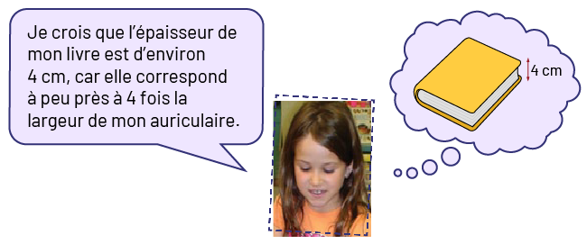 Par exemple, l’élève perçoit que l’épaisseur du livre est de 4 centimètres, mais ne comprend pas que cela équivaut à 0,04 mètre. L’utilisation répétée d’images mentales de repères concrets favorise la compréhension du sens et de la grandeur des diverses unités de mesure conventionnelles et de leurs multiples (par exemple, centimètre, mètre).