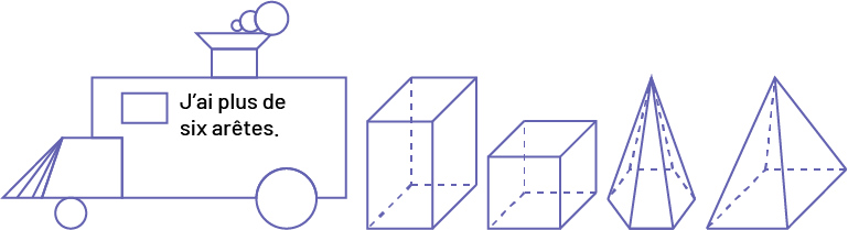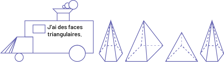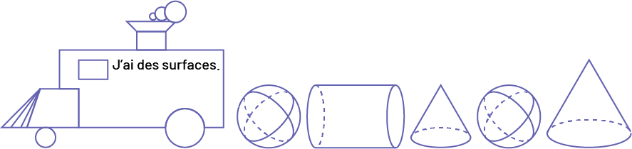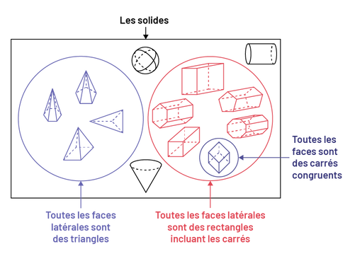 En 1re année, l’élève classe les solides selon des attributs observables (solides qui roulent, qui glissent, qui ont le même nombre d’arêtes). Graduellement, elle ou il les classe selon des attributs et des propriétés géométriques. |