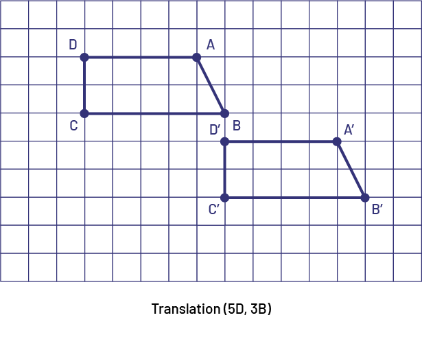 La translation est définie par sa grandeur et sa direction (représentées symboliquement par des coordonnées ou par une flèche). Elle représente un déplacement linéaire, horizontal, vertical ou oblique dans lequel la figure initiale et l’image sont congruentes. La distance entre chaque point sur la figure initiale et le point correspondant sur l’image est constante. L’orientation de l’image est la même que l’orientation de la figure initiale.