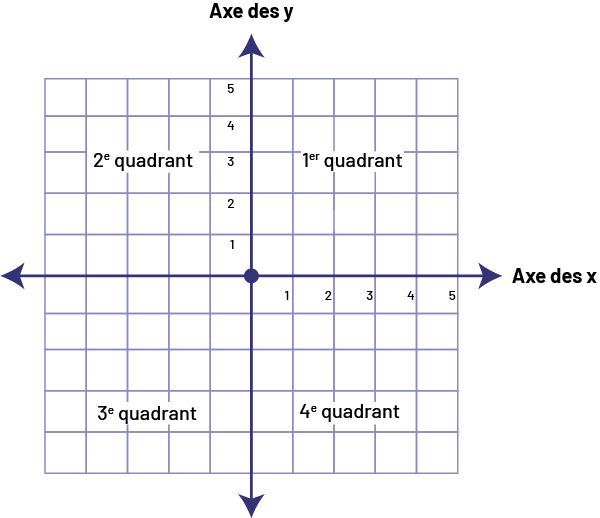 Les axes x et y divisent le plan cartésien en quatre régions appelées quadrants. Les élèves de 4e année utilisent seulement le quadrant au haut et à la droite dans le plan cartésien, soit le premier quadrant.