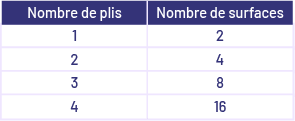 Note : Les élèves peuvent établir des liens avec le domaine Modélisation et algèbre et explorer la relation entre le nombre de plis et le nombre de surfaces créées en pliant, par exemple, une feuille de papier et en notant dans un tableau le nombre de surfaces identiques obtenues après chaque pli. Ils pourraient alors souligner que chaque fois qu’on ajoute un pli, le nombre de surfaces est doublé. image Un tableau à deux colonnes. La première