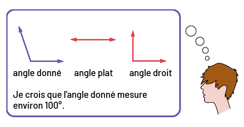 Pour estimer la mesure d'un angle donné, les élèves peuvent utiliser l'angle droit et l'angle plat comme repères. En superposant mentalement l'image de ces angles sur l'angle donné, elles et ils peuvent conclure que sa mesure est beaucoup plus près de 90°que de 180°. Elles et ils estiment alors que la mesure de l'angle donné est d'environ 100°. image Dans un rectangle arrondi se trouvent trois angles: soit un angle donné qui est formé