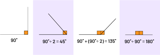 (parenthèse fermante) égale à 135 degrés. Sous la quatrième image est écrit: 90 degrés plus 90 degrés égale à 180