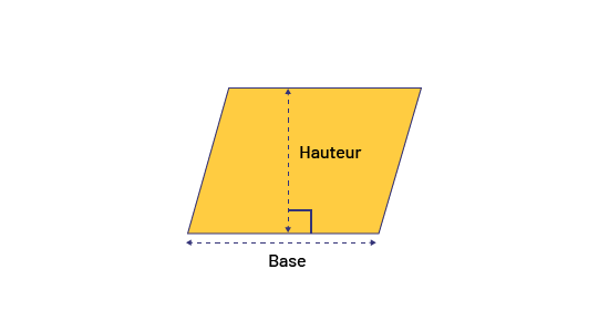 image Il y a un parallélogramme. Une ligne pointillée verticale passe au centre du parallélogramme et une ligne pointillée horizontale passe à la base. À côté de la ligne verticale est écrit: hauteur. Sous la ligne horizontale est écrit: base. Le point ou la ligne verticale et horizontale se rencontre est marqué par un carré.