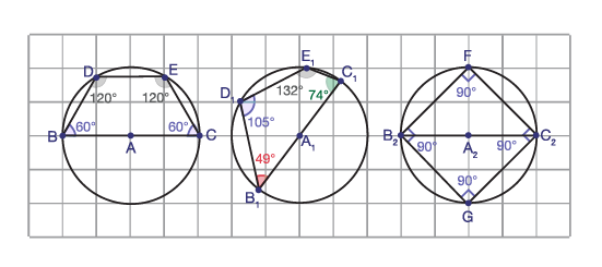 degrés, un angle de 74 degrés, et un angle de 49 degrés; le troisième a quatre angles de 90 degrés.