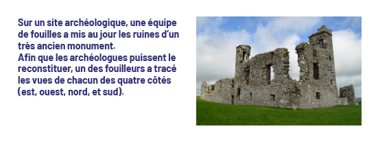 Les archéologues veulent faire une maquette des ruines de ce monument avec des cubes d’après les quatre vues que le fouilleur a tracées. Elles et ils se rendent compte qu’il y a plusieurs dispositions possibles des cubes qui respectent les vues.