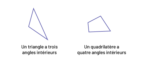 Dans les exemples ci-dessous, on voit que le triangle est formé de trois angles intérieurs et le quadrilatère, de quatre angles intérieurs.