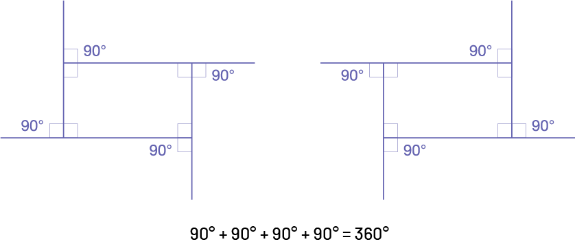 montre dans la seconde. Sous les figures est écrit: 90 degrés plus 90 degrés plus 90 degrés plus 90 degrés égale à 360