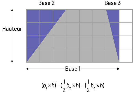 - Deux triangles peuvent être ajoutés à un trapèze pour créer un grand rectangle duquel leur aire est ensuite soustraite.