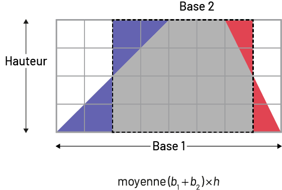 Il existe différentes façons de décomposer et de composer des trapèzes pour former des rectangles, des parallélogrammes ou des triangles. Les différentes stratégies de composition ont leurs formules propres, mais équivalentes.