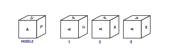 un « a »; la vue du haut est marquée par un « u »; et la vue d’un côté est marquée par un « p ».À la droite du cube,