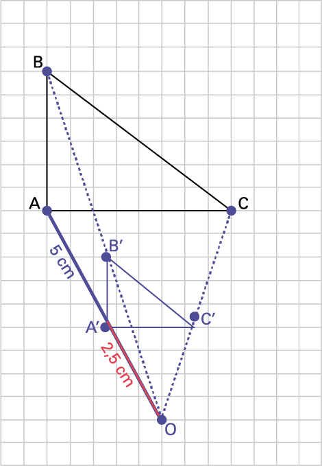 b) Pour chaque sommet ABC, je trace une droite qui relie chaque point au centre d’homothétie. À l’aide d’une règle, je mesure la distance entre chaque sommet de la figure et le centre d’homothétie. Je divise ensuite chacune des distances par le rapport d’homothétie \(\frac{1}{2}\). Par exemple, je mesure la longueur du segment entre O et A. Le segment OA mesure 5 cm. Je trace alors un point sur le segment à 2,5 cm pour former le segment OA'. Je reprends la même démarche pour former les segments OB' et OC'.