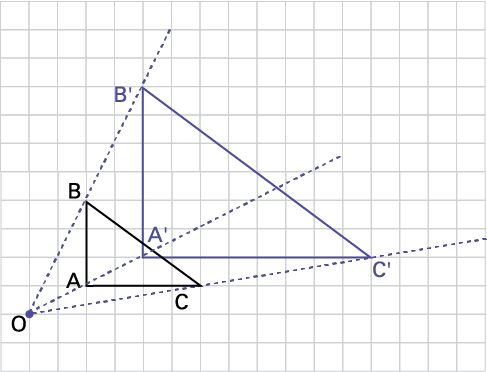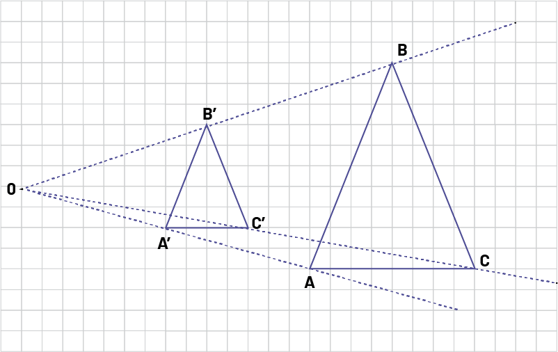 a) Pour chaque sommet ABC, je trace une droite qui relie chaque point au centre d’homothétie. À l’aide d’une règle, je mesure la distance entre chaque sommet de la figure et le centre d’homothétie. Je multiplie ensuite chacune des distances par le rapport d’homothétie 2. Par exemple, je mesure la longueur du segment OA. Le segment OA' mesure 4 cm. Je trace alors un segment OA' de 8 cm pour former le segment OA' en passant par le point A, car le rapport d’homothétie est de 2. Je reprends la même démarche pour former les segments OB' et OC'.